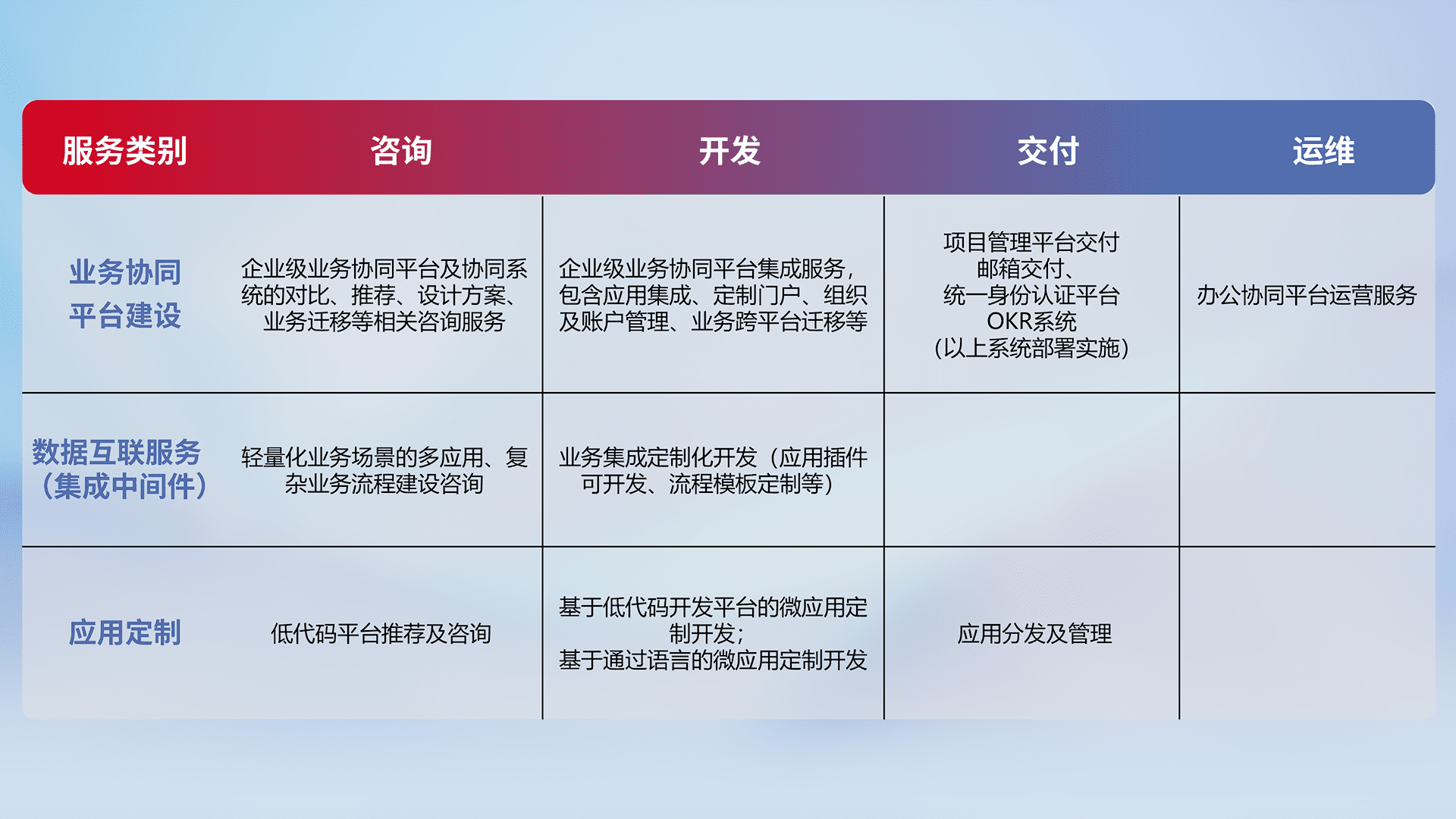针对钉钉、、、、企微、、、、IDaas等平台级产品提供产品的规划、、、、方案、、、、交付、、、、定制化开发等服务,,实现如统一协同办公、、智能客户服务、、、混合会议管理、、、、智能数据查询、、、、等业务场景,,实现数字化转型。。。