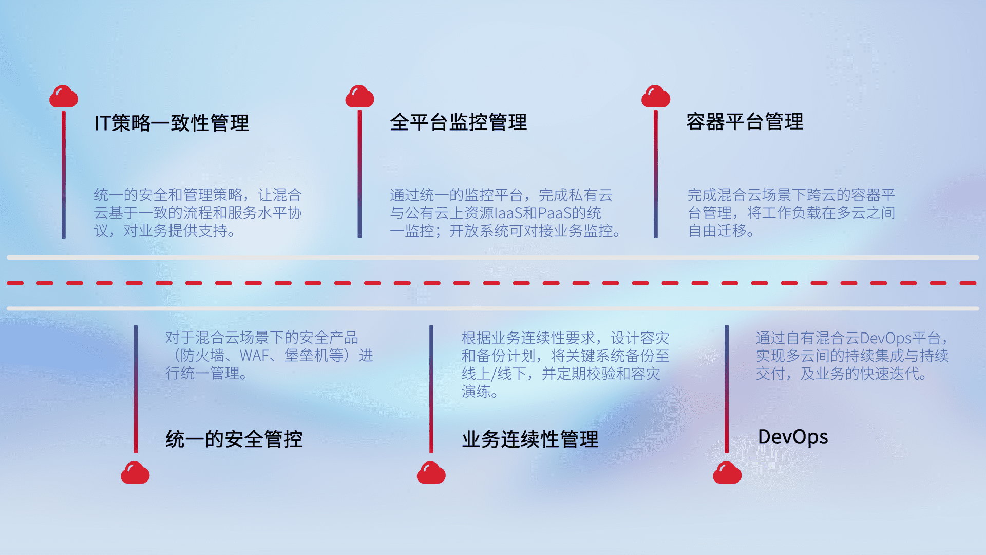 通过多云纳管,,以统一的资源数据模型把客户的云资源进行抽象和封装,,进而实现对多云资源的统一操作,,,保障云资源管理的可靠性、、、稳定性与可用性。。。。量身定制化运维内容,,配置、、开发运维、、、、补丁管理、、、、备份、、监控、、、、认证和访问管理、、、、审计和日常巡检等,,保障在用云过程中的可靠度,,稳定度以及高可用率。。